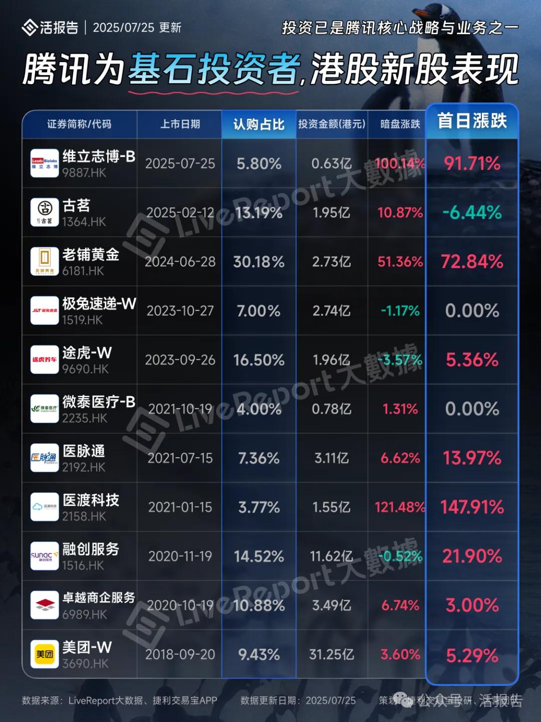 7月25日,腾讯参与基石投资的维立志博-B正式登陆港交所,开盘直接高开106.9%,随即股价快速拉升至79.6港元,涨幅127.4%,上午10:00后大量小单抛售,股价高位回落,涨幅收窄,最终收涨91.71%,报67.1港元/股,首日成交额高达23.49亿港元,最新总市值129.75亿港元按首日开盘价计,一手收益3740港元