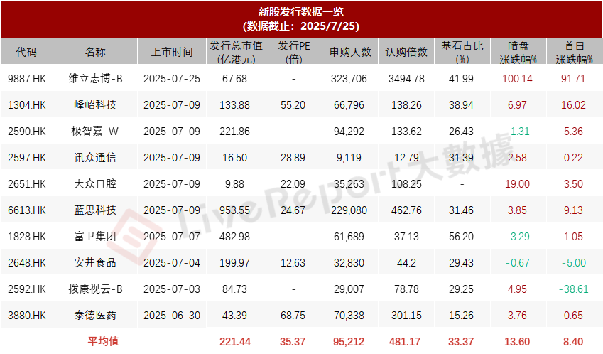 最近一周,维立志博-B港交所上市,维立志博-B招股获超32万人申购,国配认购倍数超40倍(近三年最高),是散户和机构追捧的热门新股,上市首日股价表现亮眼,一度翻倍,最终收涨91.71%。