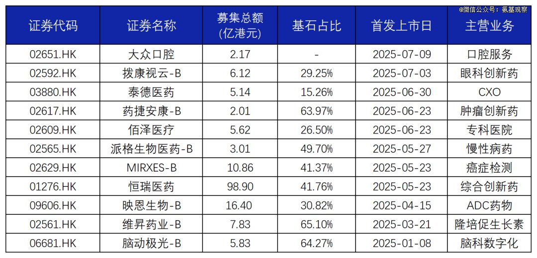 但今年以来,随着资本市场回暖,这一担忧正在消散。二级市场融资渠道已显著畅通:截至目前,已有10家药企完成IPO,募资总额逼近200亿港元。