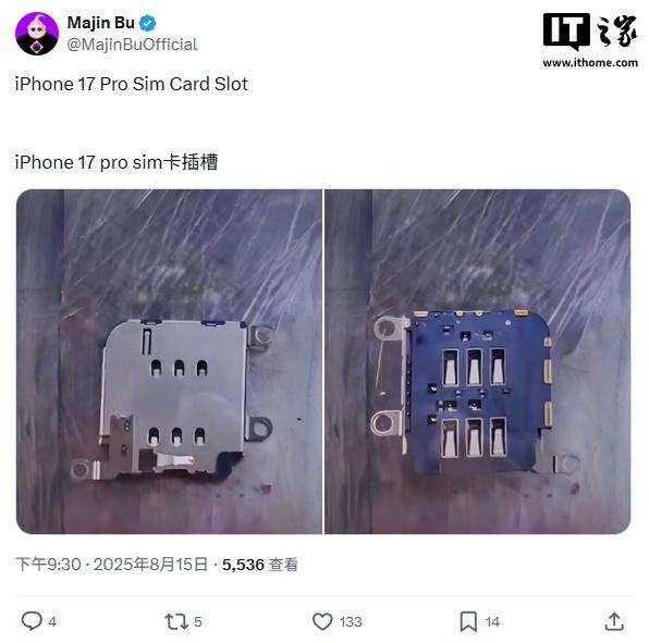 爆料者 Majin Bu 今日放出的一组图片显示,部分 iPhone 17 Pro 工程机仍保留实体 SIM 卡槽,意味着苹果已经为可能无法在部分国家地区推出 eSIM 版 iPhone 17 Pro 的情况准备了第二套方案。