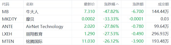中概股收盘跌幅前五的个股为:牛大人跌47.82%,摩贝跌33.33%,AirNet Technology跌27.86%,丽翔教育跌27.53%,铭腾国际跌26.12%。(格隆汇)