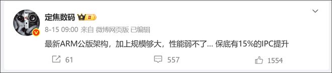 该博主此前还爆料称,玄戒O2将采用Arm最新发布的公版架构,芯片整体规模更大,性能表现有望提升15%以上。其于15日发文称,“小米玄戒O2比想象中的要强,最新ARM公版架构,加上规模够大,性能弱不了… 保底有15%的IPC提升。”