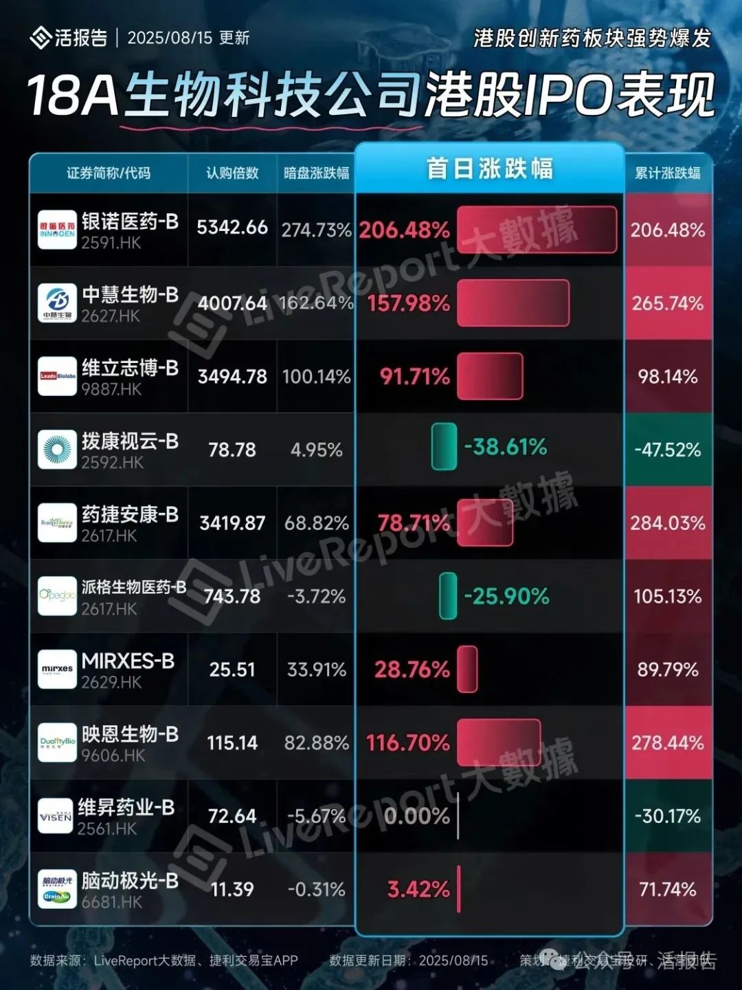 最近一周,两家18A中慧生物-B、银诺医药-B正式上市,首日表现相当亮眼,分别涨157.98%、206.48%,今年港股18A生物科技公司IPO赚钱效应显著,打新热潮强势回归。