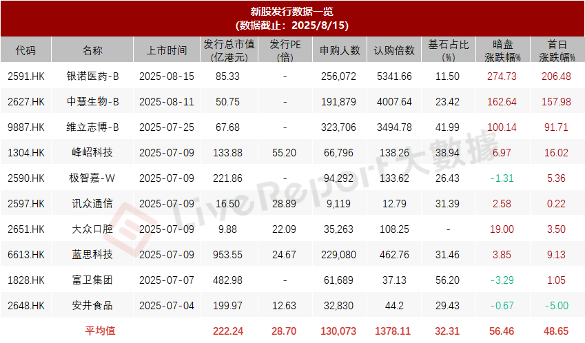 近10只新股暗盘平均上涨56.46%,首日平均上涨48.65%;近三家18A生物科技公司涨势一个比一个猛,不过中签也越来越难,七月底至今上市的新股,投资者们都在拼资金打新,拼到乙组都不能稳中一手,银诺医药-B甚至顶头槌都要抽签;截至目前A+H的天岳先进孖展的认购倍数超2400倍。