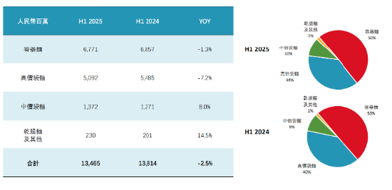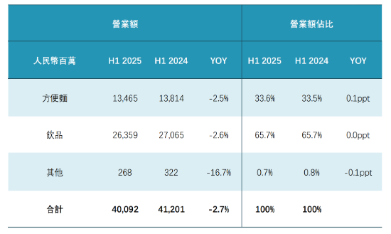 从各业务分部来看,2025年上半年,康师傅两大核心业务——方便面和饮品收入均呈下滑趋势。其中,方便面业务收益134.65亿元,同比下降2.5%,营收占比33.6%。饮品业务收益263.59亿元,同比下滑2.6%,营收占比65.7%。