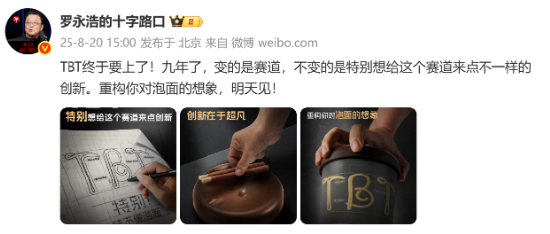 20日,罗永浩通过个人微博发布预热公告称:“TBT终于要上了!九年了,变的是赛道,不变的是特别想给这个赛道来点不一样的创新。”