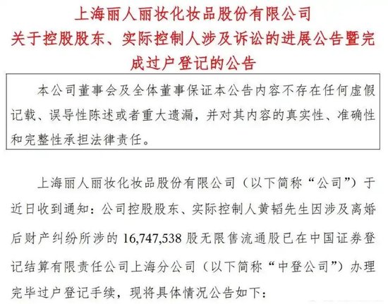 2025年8月21日晚,丽人丽妆发布公告称,黄韬与翁淑华离婚纠纷所涉股权已完成过户。