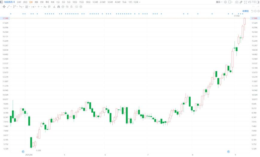 和铂医药-B(2142.HK)午后进一步上扬,一度涨4.79%至17.95港元,股价续创历史新高,年内飙升865%,市值超156亿港元。