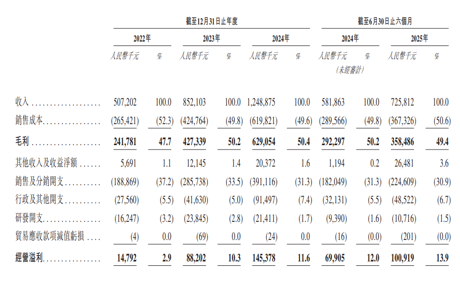 不同集团于整个往绩记录期间实现强劲的财务增长。公司于2022年、2023年及2024 年以及截至2024年及2025年6月30日止六个月分别录得收入5.07亿元、8.52亿元、12.49亿元、5.82亿元及7.26亿元人民币;同年╱期,公司的毛利分别为2.42亿元、4.27亿元、6.29亿元、2.92亿元及3.58亿元人民币,毛利率为47.7%、50.2%、50.4%、 50.2%及49.4%。
