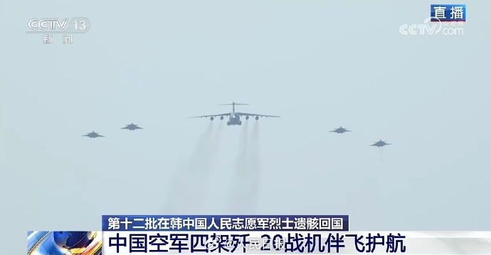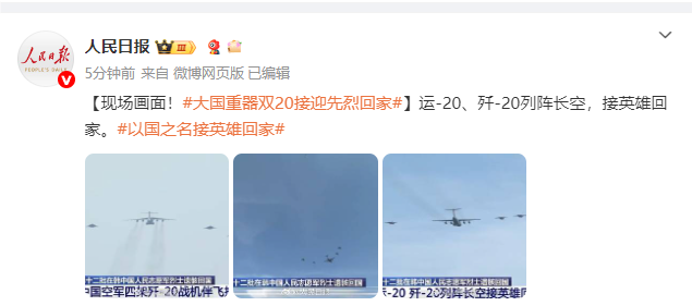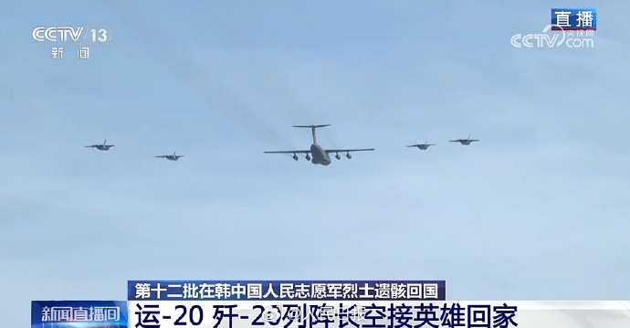 运-20、歼-20列阵长空,接英雄回家。