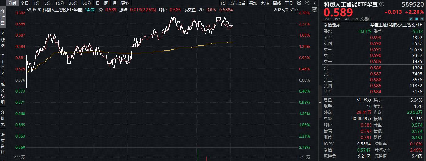 今日(9月10日)国产AI强势冲锋!澜起科技涨超6%,寒武纪、凌云光涨逾5%,晶晨股份涨近5%,热门ETF方面,重点布局国产AI产业链的科创人工智能ETF(589520)场内价格盘中涨超2.6%,现涨2.26%,值得关注的是,该ETF场内频现溢价区间,显示买盘资金更为强势!