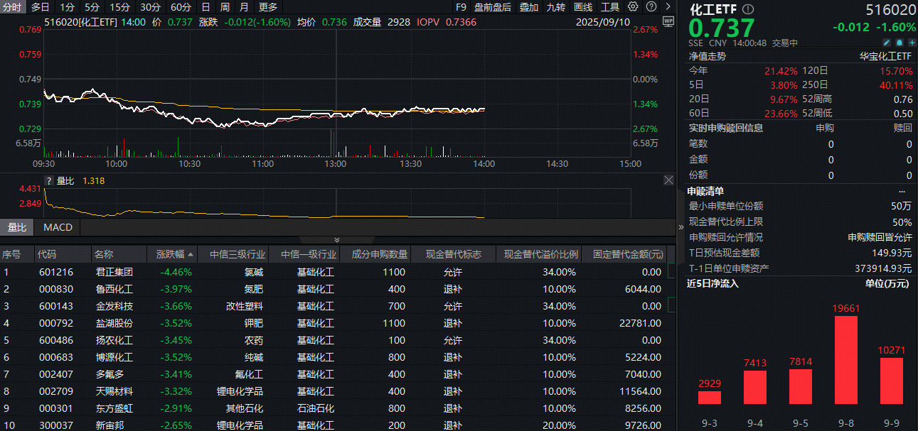 化工板块今日(9月10日)午后跌幅收窄,截至发稿,反映化工板块整体走势的化工ETF(516020)场内价格跌1.6%。