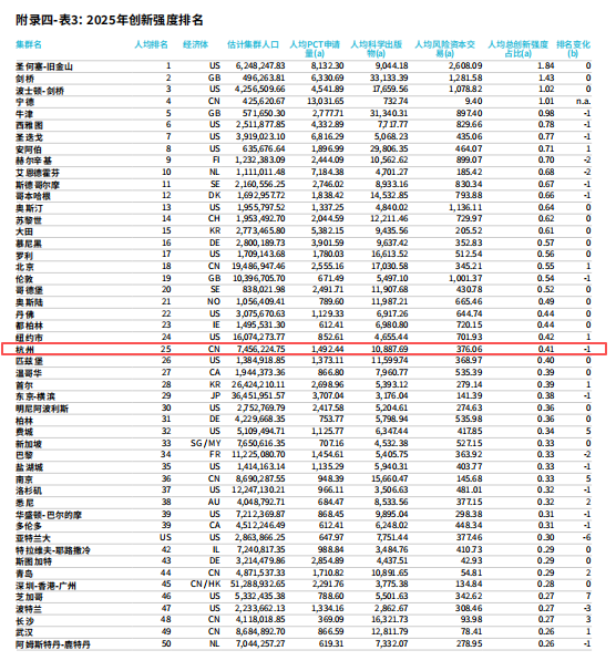 该排名通过三项核心指标,即《专利合作条约》(PCT)提交的国际专利申请量、科学论文发表量,以及今年新增的风险资本交易量,来识别世界级创新活动在当地的集中程度。