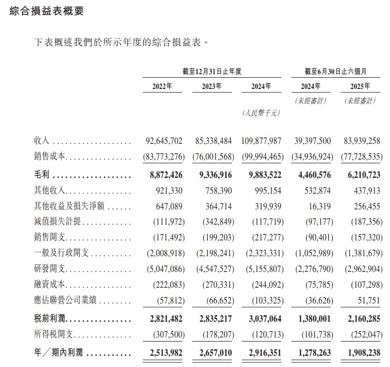 财务方面,于2022年度、2023年度、2024年度以及截至2025年6月30日止六个月,华勤技术实现收入分别约为926.46亿元、853.38亿元、1098.78亿元、839.39亿元人民币;年/期内利润分别约为25.14亿元、26.57亿元、29.16亿元、19.08亿元人民币。