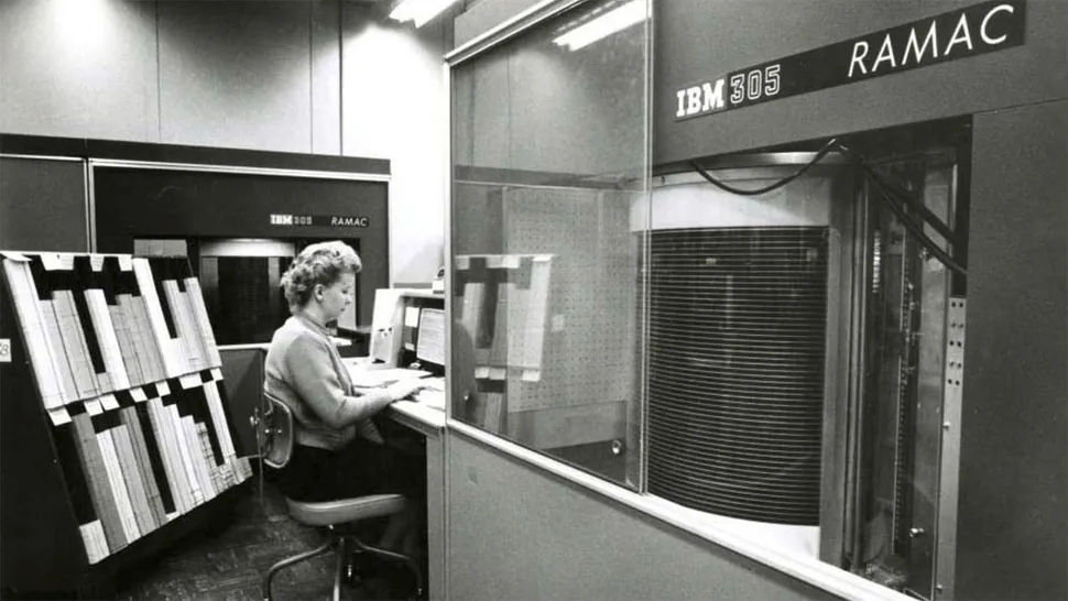 ▲ 硬盘与 IBM 305 计算机系统组合而成的系统,体积有一个房间那么大