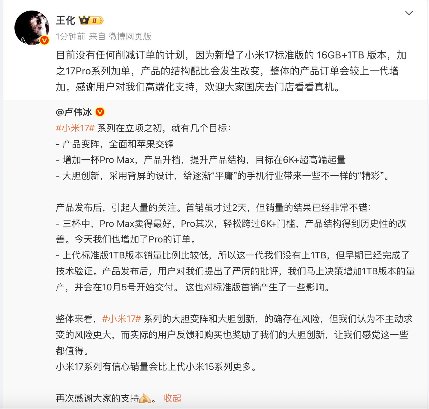 卢伟冰:小米17标准版增加1TB版本 10月5日开始交付