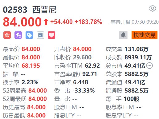 西普尼(2583.HK)今日首日在港挂牌上市,高开183.78%报84港元。一手100股,最多账面赚5440港元。