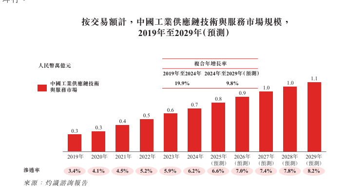 2024年中国工业供应链技术与服务市场规模以交易额计算为人民币0.7万亿元,预计到2029年将达到人民币1.1万亿元,复合年增长率为9.8%。于2024年,中国工业供应链技术与服务渗透率(即工业供应链技术与服务市场规模除以工业供应链市场规模)为6.2%,而美国的该渗透率约为15%。中国工业供应链技术与服务渗透率预计于2029年将增至8.2%。除本公司外,中国其他主要工业供应链技术与服务提供商包括西域、中电港、嘉立创集团及震坤行