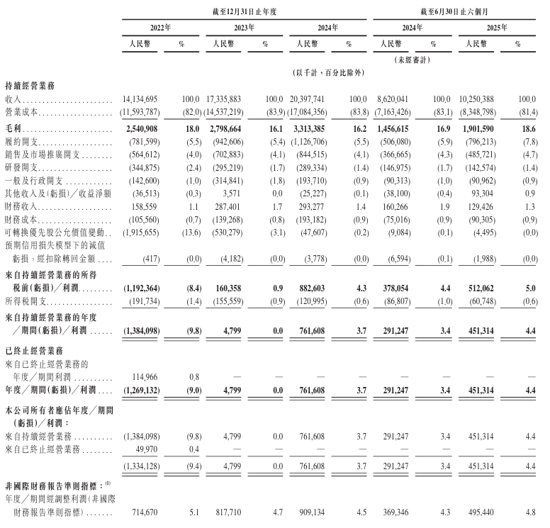 公司于2022年-2024年,分别录得持续经营业务收入141.35亿元、173.36亿元及203.98亿元。2025年持续经营业务收入同比增长18.91%至102.5亿元。