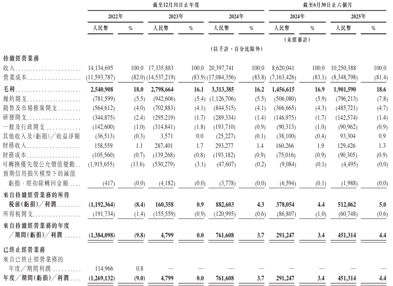 业绩方面,2023年、2024年及2025年截至6月30日止六个月,该公司实现收入分别约为173.36亿元、203.98亿元及102.50亿元人民币;同期,年度/期内利润约为479.9万元、7.62亿元、4.51亿元人民币。
