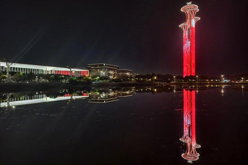 夜色漫过街头,奥林匹克塔换上“中国红”华服,“热烈庆祝中华人民共和国成立76周年”“祝福祖国”“欢度国庆”的字样与光影幻化的绸带、礼花、和平鸽以及娇艳的牡丹、月季交织,缓缓铺展开一幅璀璨的国庆画卷。