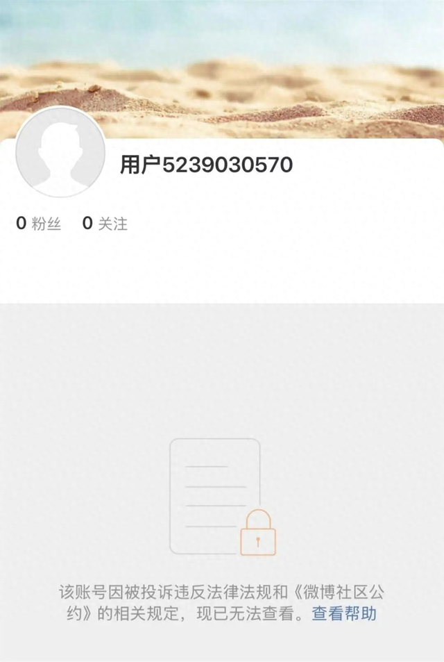 户晨风微博账号页面显示:该账号因被投诉违反法律法规和《微博社区公约》的相关规定,现已无法查看。账号头像变灰,关注及粉丝数量清零。