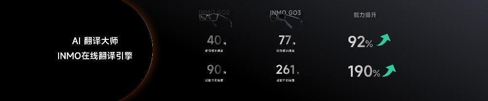 在软件功能方面,INMO GO3能听得懂77种语言,相比GO2的40种提升了92%。它还能翻译成260多种目标语言,相比GO2的90种提升了190%,实现了智能眼镜行业最全的语种支持,翻译准确率高达98%。