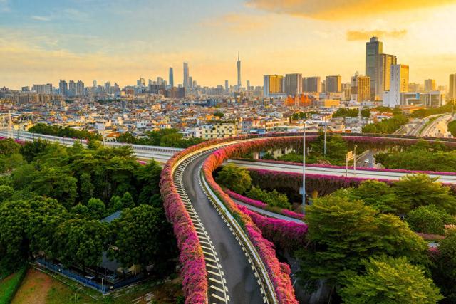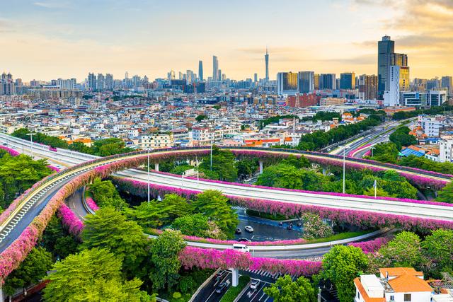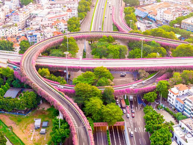 10月14日,广州东晓南路与新窖西路立交的粉红色三角梅璀璨绽放。视觉中国