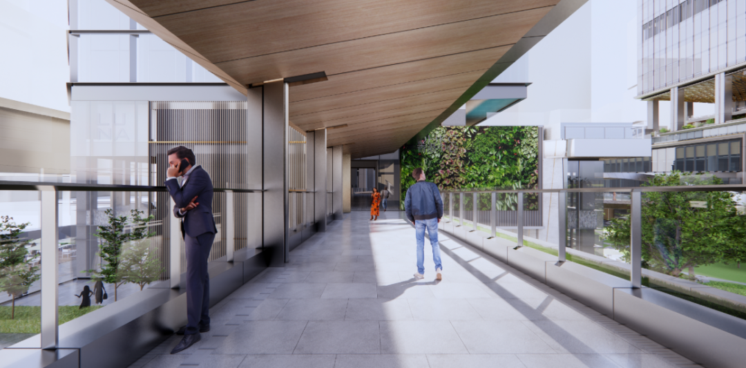 其项目经理及设计主创庄文靓表示:“二层连廊起到打通‘任督二脉’的作用。我们将香港成熟的人车分流设计经验融入东莞国际商务区建设。上班族无需下到地面,就能在不同建筑间轻松通勤——雨天不湿鞋、晴天有遮阳,远离路面的喧嚣与炎热。”
