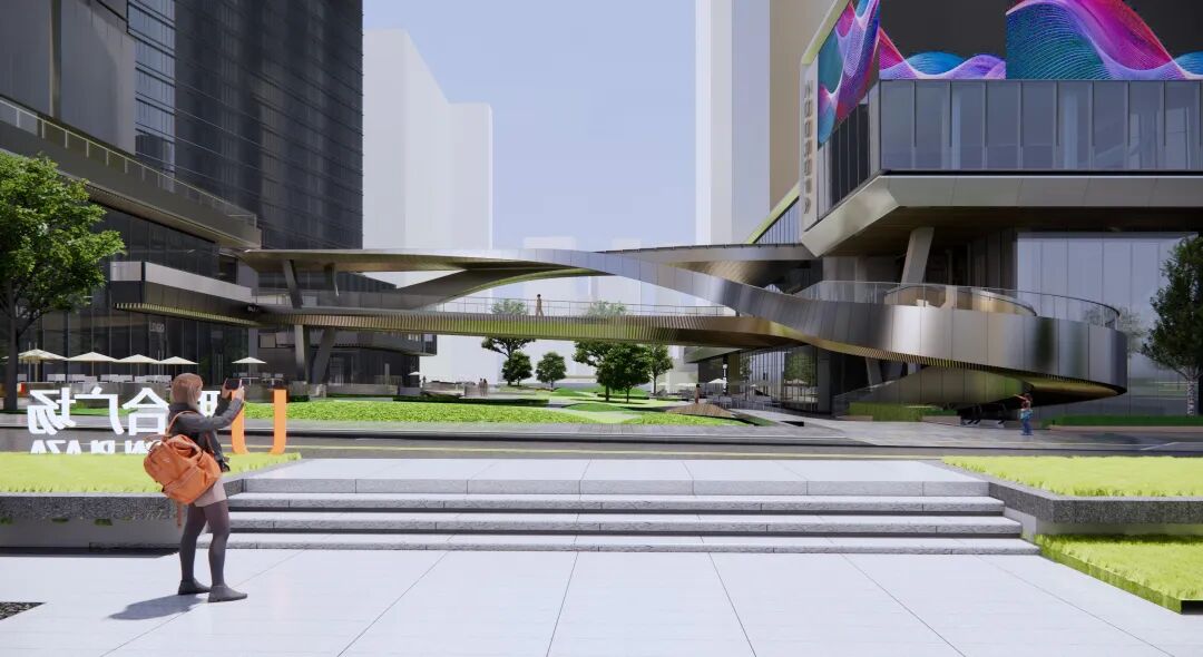 绿轴天桥是凌驾于绿轴公园上方的连廊,属于空中花园型。通过与邻近的楼梯进行一体化设计,形成流畅的整体流线。市民可通过旋转楼梯盘旋而上,自然衔接至连廊,俯瞰下方的绿轴公园,这里有阔落的停留空间,未来可能还有移动摊位。