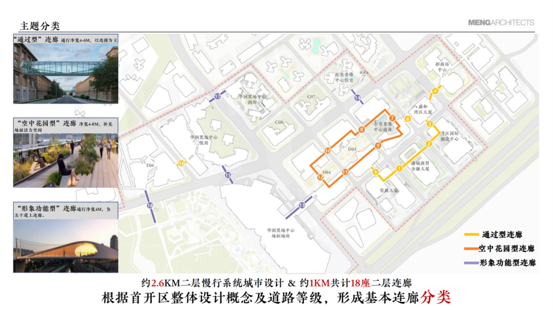 根据《首开区空中连廊统筹研究》,东莞CBD的连廊在功能上各有侧重:有位于次干道、兼具形象展示的“形象功能型”;有以高效连接为主的“通过型”;还有补充地面活力、营造休闲氛围的“空中花园型”。