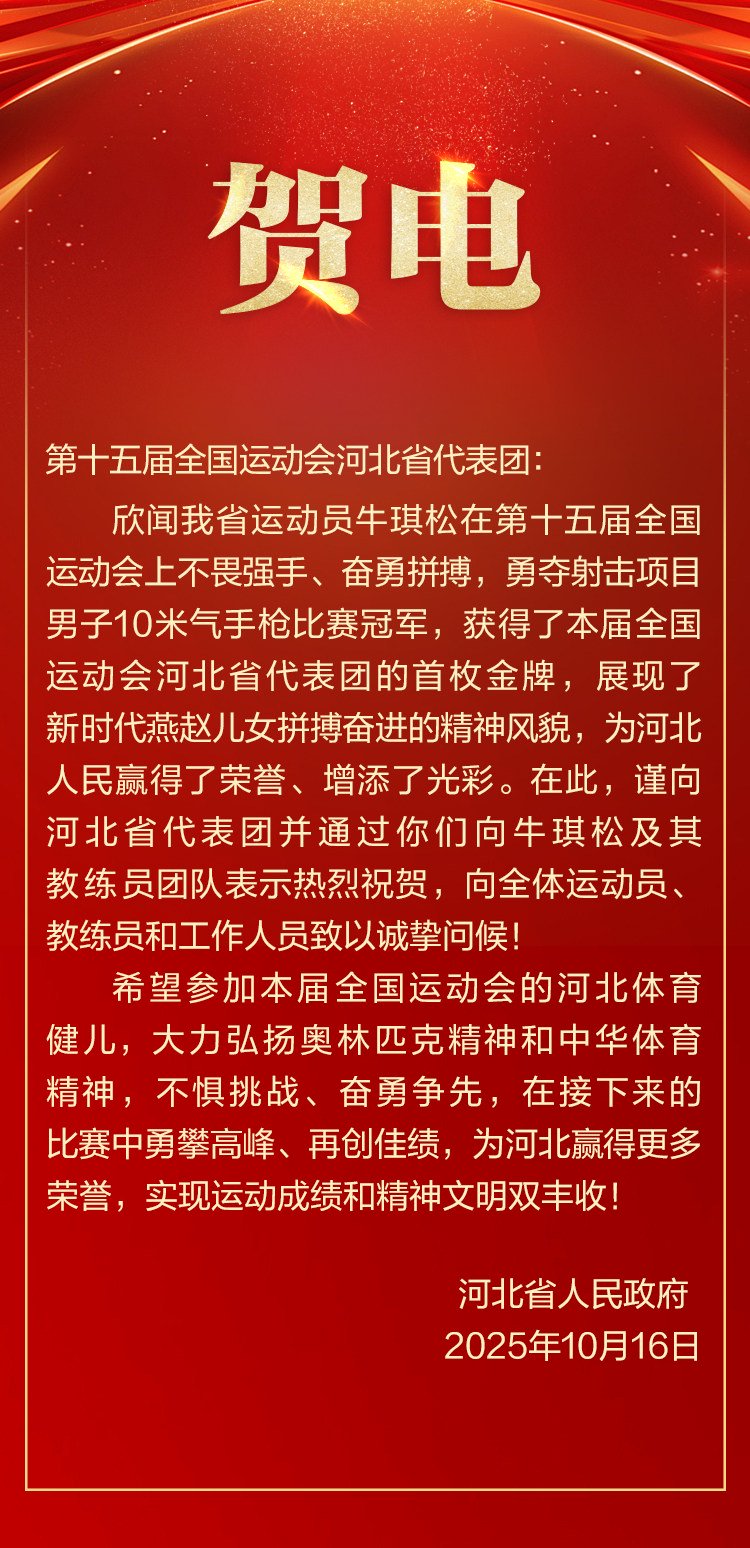 河北省人民政府向第十五届全国运动会河北省代表团致贺电