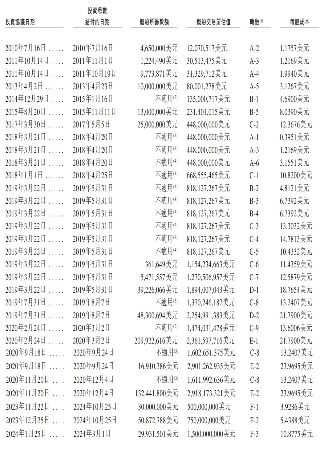 明略科技2024年10月完成3000万美元F-1轮融资,投前估值为5亿美元,每股成本为3.9286美元;同期,完成了5087万美元F-2轮融资,投前估值为7.5亿美元,每股成本为5.4388美元;2024年3月完成2993万美元F-3轮融资,投前估值15亿美元,每股成本为10.8775美元。
