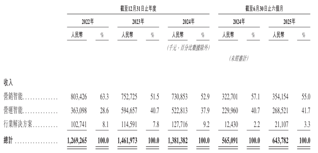 明略科技的收入分别为营销智能、营运智能和行业解决方案三部分,其中,明略科技2025年上半年来自营销智能收入为3.54亿元,占营收的比例为55%;来自营运智能收入为2.68亿元,占比为41.7%。