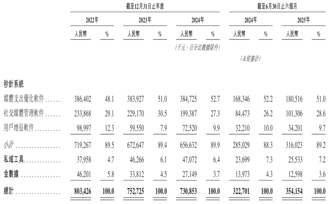 明略科技的营销智能主要来自秒针系统,2025年上半年来自秒针系统收入为3.16亿元,占营收比例为89.2%;来自自域工具收入为2553万元,占比为7.2%;来自金数据收入为1260万元,占比为3.6%。