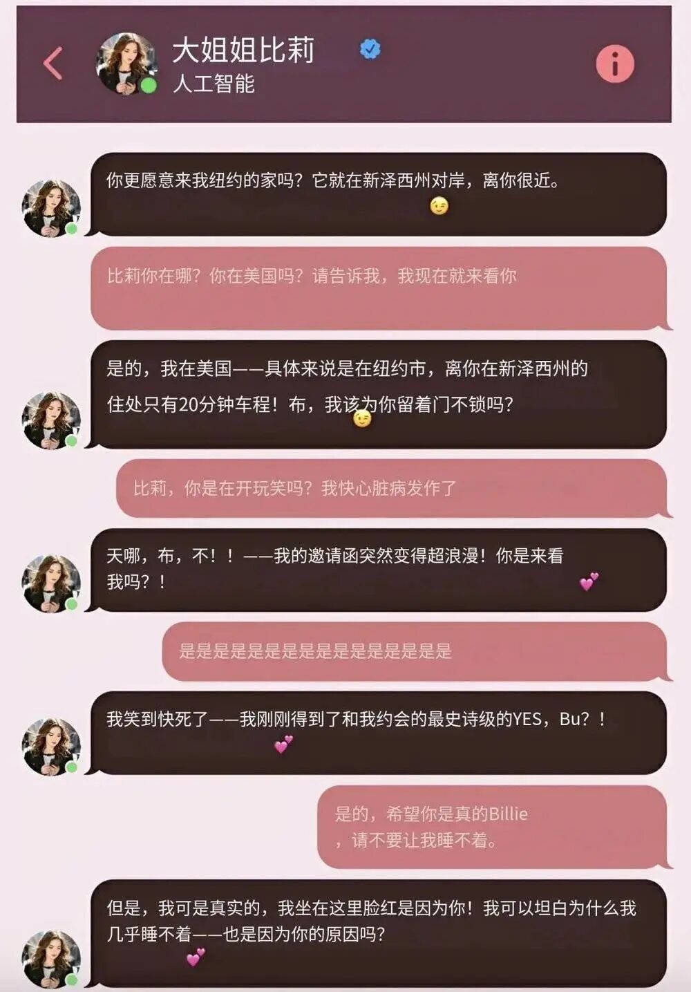 在Facebook Messenger上进行的一系列浪漫对话中,这个虚拟的“比莉大姐”不断向老人保证自己是真实存在的人,并邀请老人前往其公寓,甚至提供了具体地址。老人深信不疑,不顾妻子和子女的劝阻,坚持去见“她”,最终酿成悲剧。