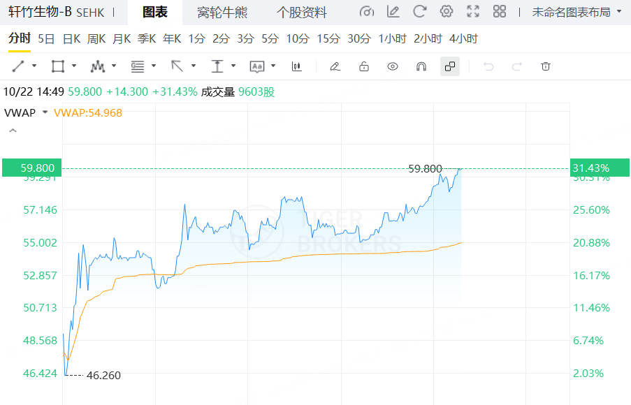 10月22日,轩竹生物-B午后涨幅扩大至31%,成交额超2亿港元。