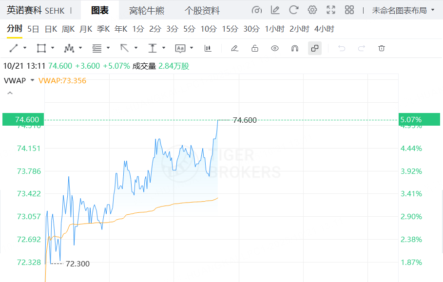 10月21日,英诺赛科盘中涨超5%,报74.6港元。