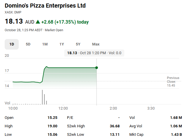 10月28日,据报道,贝恩资本(Bain Capital)正考虑以高达40亿澳元(约合26亿美元)的交易金额收购达美乐披萨(DPZ.US)。消息传出后,达美乐披萨股价在悉尼交易中一度飙升23%。截至当地时间上午11点22分停牌前,股价上涨17%,至每股18.13澳元,令公司市值达到17亿澳元。
