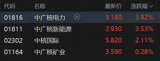 10月27日,港股核电股普遍上涨,其中,中广核电力涨4%,中广核新能源涨3.5%,中核国际涨超2%,中广核矿业跟涨。