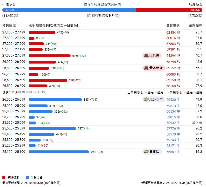 智通财经APP获悉,截至10月28日,恒指最新的牛熊街货比例为67:33。