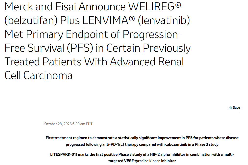 智通财经APP获悉,10月28日,默沙东(MRK.US)宣布两则消息:1)评估双重口服疗法Welireg(贝组替凡)联合仑伐替尼用于治疗既往接受抗PD-1/L1疗法后疾病进展的晚期肾细胞癌患者的III期LITESPARK-011试验达到了其无进展生存期(PFS)的主要终点之一。贝组替凡是默沙东首创的口服缺氧诱导因子-2α(HIF-2α)抑制剂。