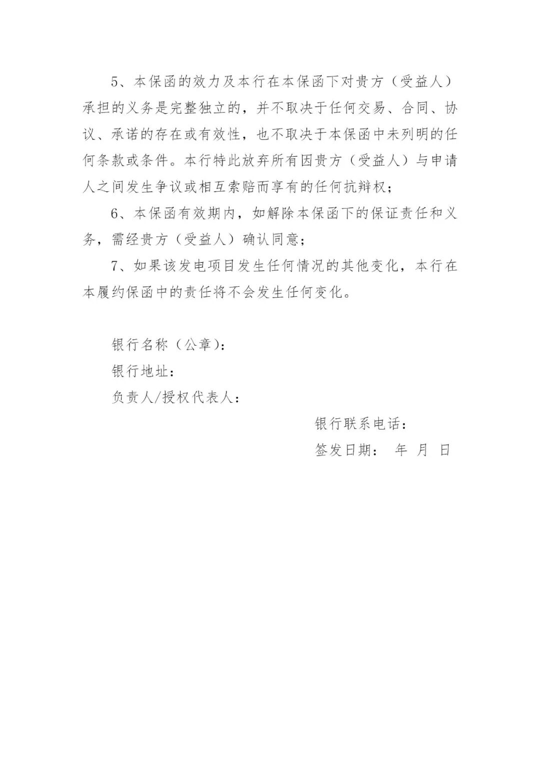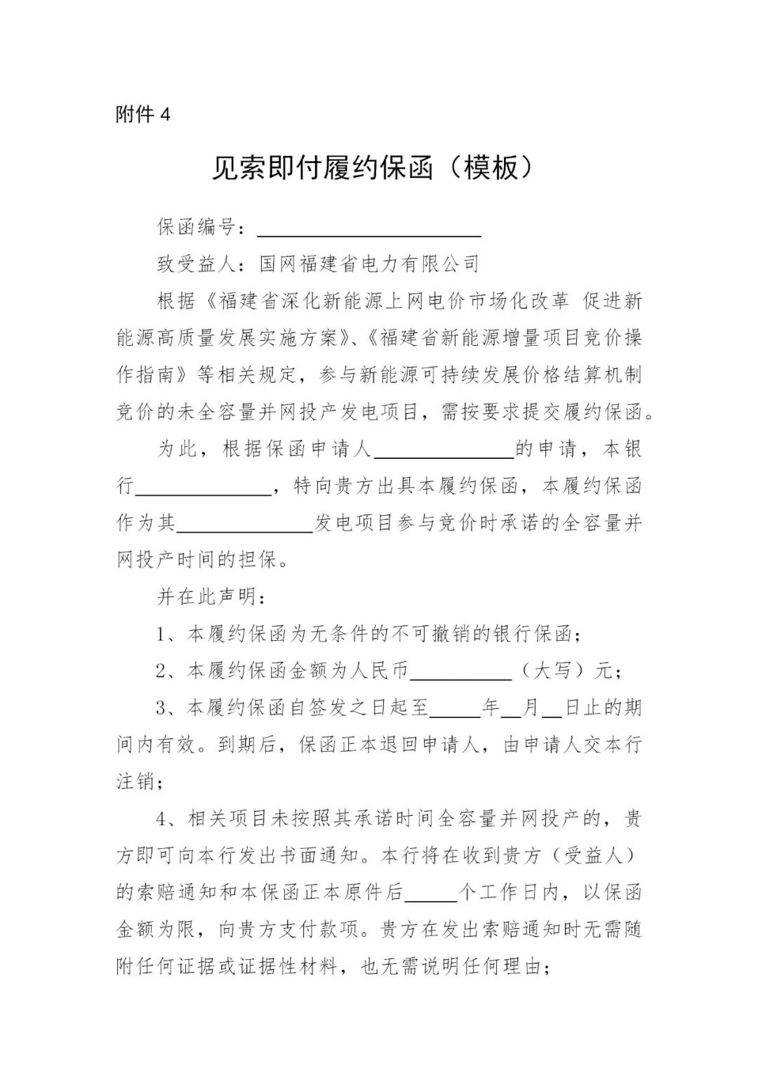 未投产的新能源项目需提交银行开具的、符合国家规定的履约保函;代理商需为代理的未投产项目提交共用履约保函;已投产项目原则上不提交履约保函;直接参与竞价的自然人户用分布式光伏用户暂免交履约保函。履约保函的有效期限至少需覆盖项目申报投产日期的次月1日后240个自然日。履约保函模板见附件4。