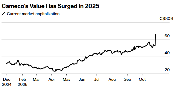 周二,全球最大铀燃料供应商之一、加拿大铀矿公司Cameco(CCJ.US)市值上涨逾 120 亿加元(约合 87 亿美元),其股价创下历史新高,原因是该公司旗下西屋电气宣布与美国政府达成协议,将建造至少价值 800 亿美元的新核反应堆。该股票在周二美股收盘时上涨超过 23%,而今年截至目前其涨幅已超过 100%。