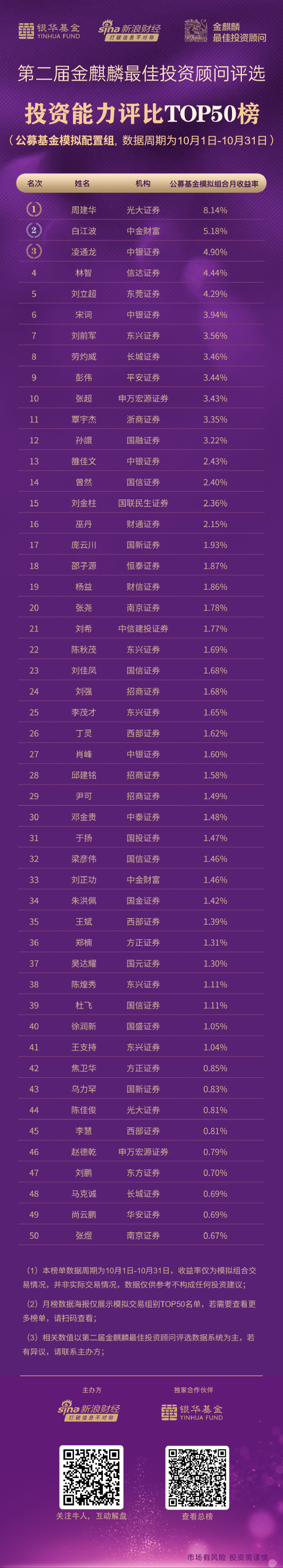目前金麒麟最佳投资顾问评选火热进行中!股票模拟交易、场内ETF模拟交易、公募基金模拟配置、社交服务评比……万名投顾大PK,10月月榜数据(周期为10月1日-10月31日)显示,公募基金模拟配置组评比,光大证券投顾周建华(来自顺德大良证券营业部)以月收益率8.14%居月榜首位。