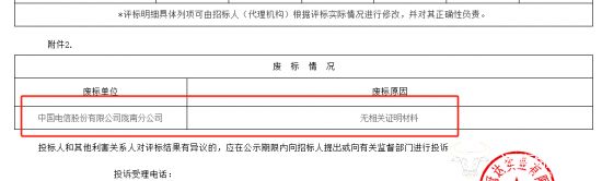 值得一提的是,项目废标情况显示,中国电信陇南分公司因无相关证明材料被废标,具体是什么证明材料并未说明。难道是因为报价不合理?
