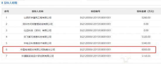 根据公示,该项目共有7家投标人,其中,中国电信陇南分公司直接“顶格报价”,其投标金额为6000万元。