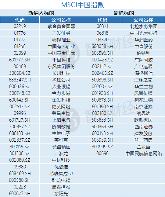 具体来看,MSCI中国指数本次新增26只标的、剔除20只标的,包括恺英网络、长盈精密、英维克等17只A股,以及紫金黄金国际(02259)、赣锋锂业、广发证券、中国有色矿业等9只港股。剔除了北控水务集团、中国光大银行、华润医药等4只港股标的以及伯特利等16只A股标的。