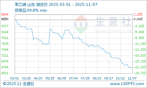 据生意社商品分析系统,本周苯乙烯市场弱势运行,周初均价6752元/吨,周末均价6706元/吨,周内跌幅0.68%。
