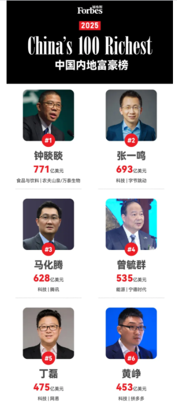 2025福布斯中国内地富豪榜发布:拼多多黄峥以453亿美元财富位列第六名